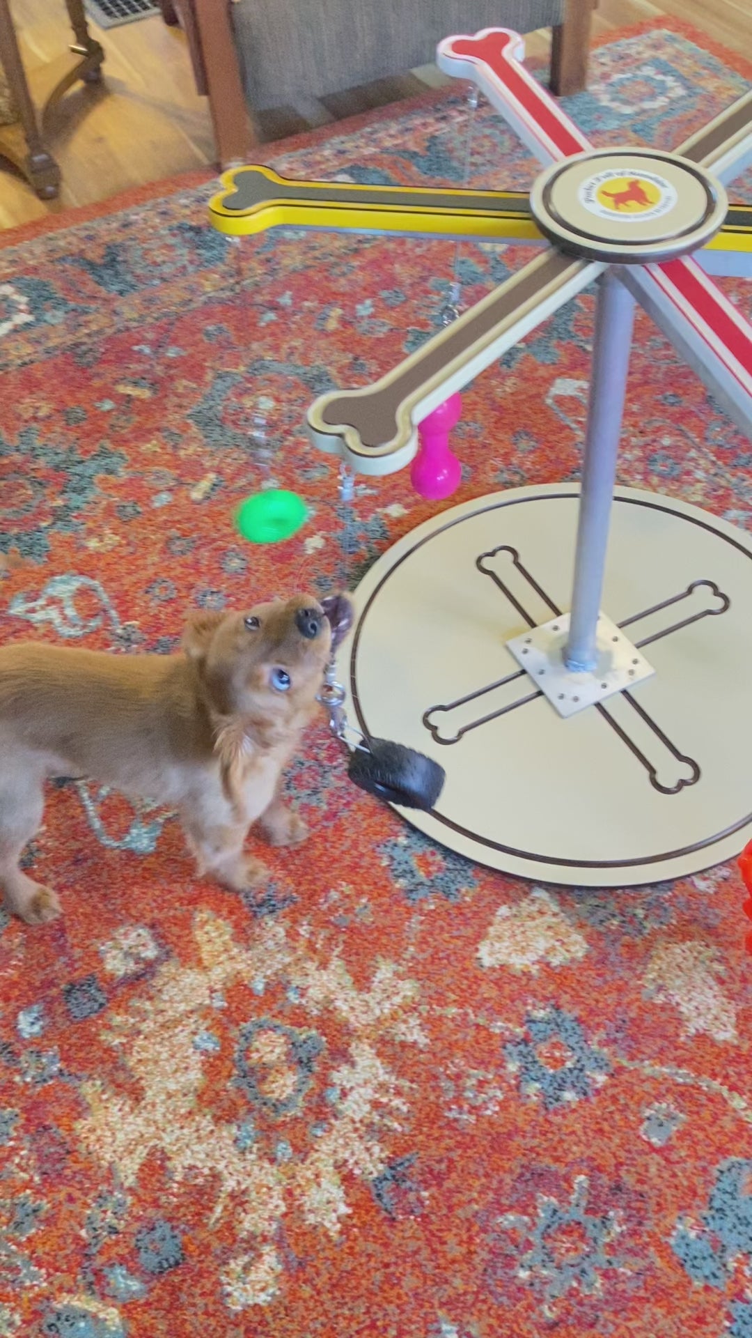 At around four weeks of age, the puppies begin to explore their environment by mouthing, batting, and pulling at toys. By six weeks, they've already mastered the skill of making spinners turn, showcasing their problem-solving abilities and developing gross motor skills. Providing high-quality toys is essential for their development, and the inclusion of Easy Clips makes it convenient to switch out toys as the litter matures.